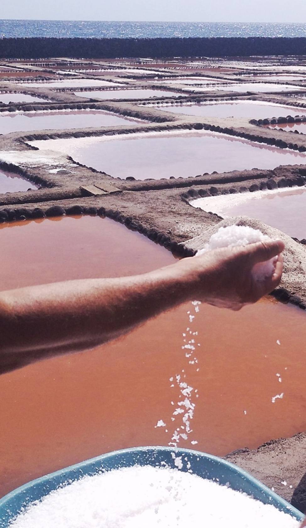 豊かな気候に恵まれたグランカナリア島の美しい塩田。塩の結晶の表面だけを、職人が木製の器具でかき集めた天然海塩。